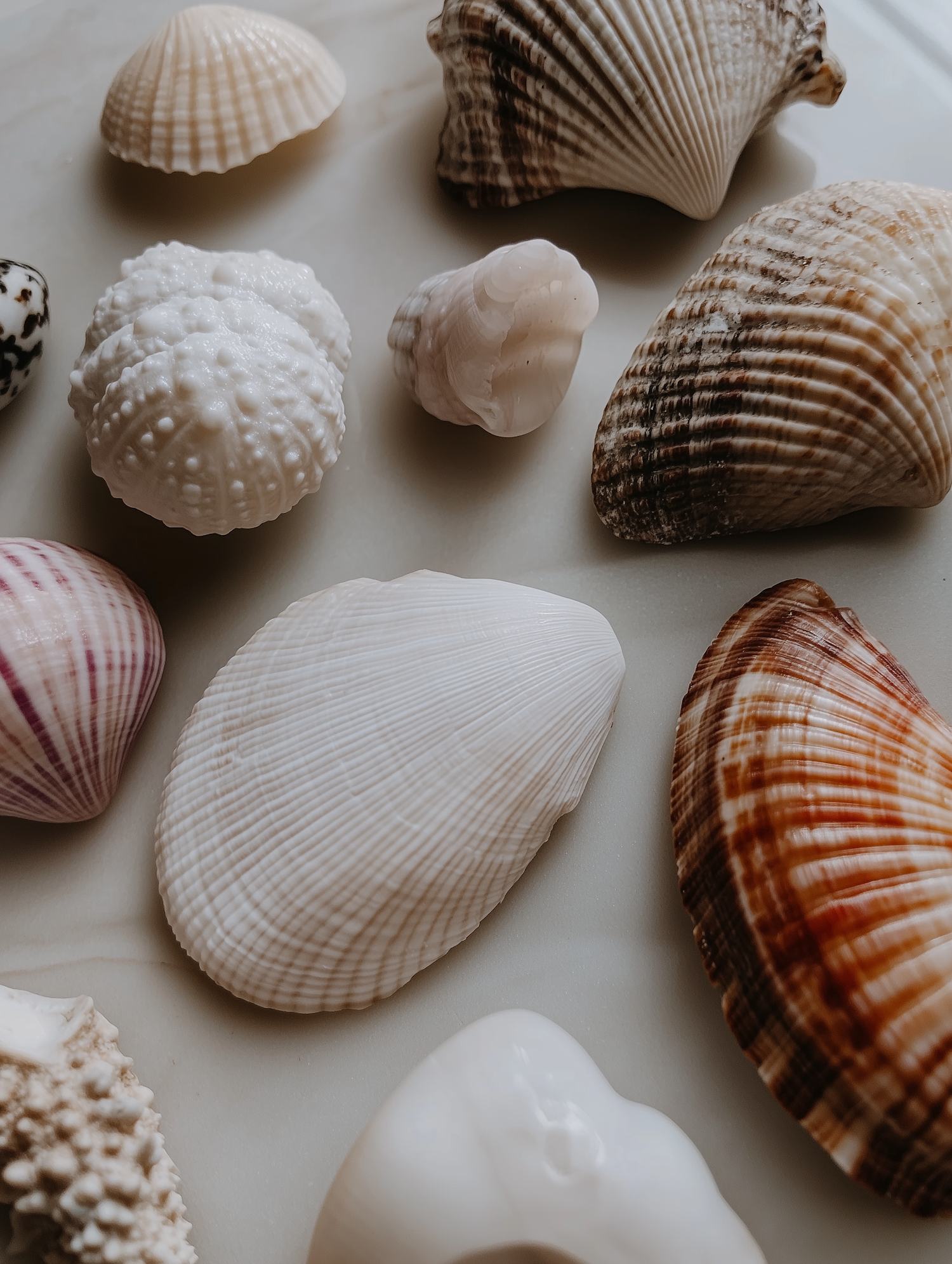 A close-up of various seashells with intricate textures and natural hues, arranged on a smooth, light surface.
