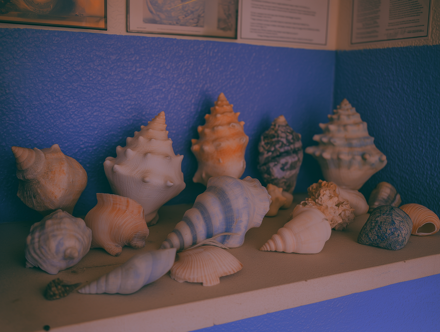 A vibrant assortment of seashell stock on a shelf with a textured blue wall, showcasing natural shapes and earthy tones.
