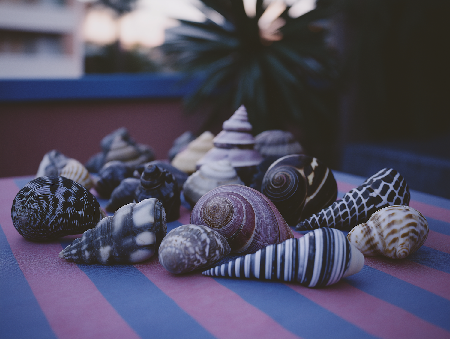 Seashell stock with intricate patterns displayed on a striped surface, set against a dim outdoor backdrop.