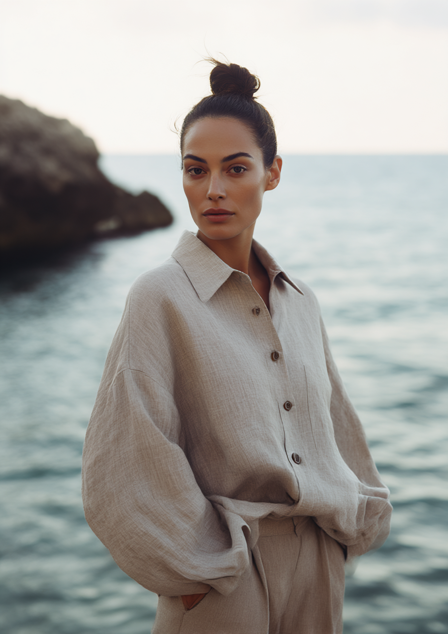 A serene portrait by the water with natural tones and elegant, understated clothing complementing the muted seascape.