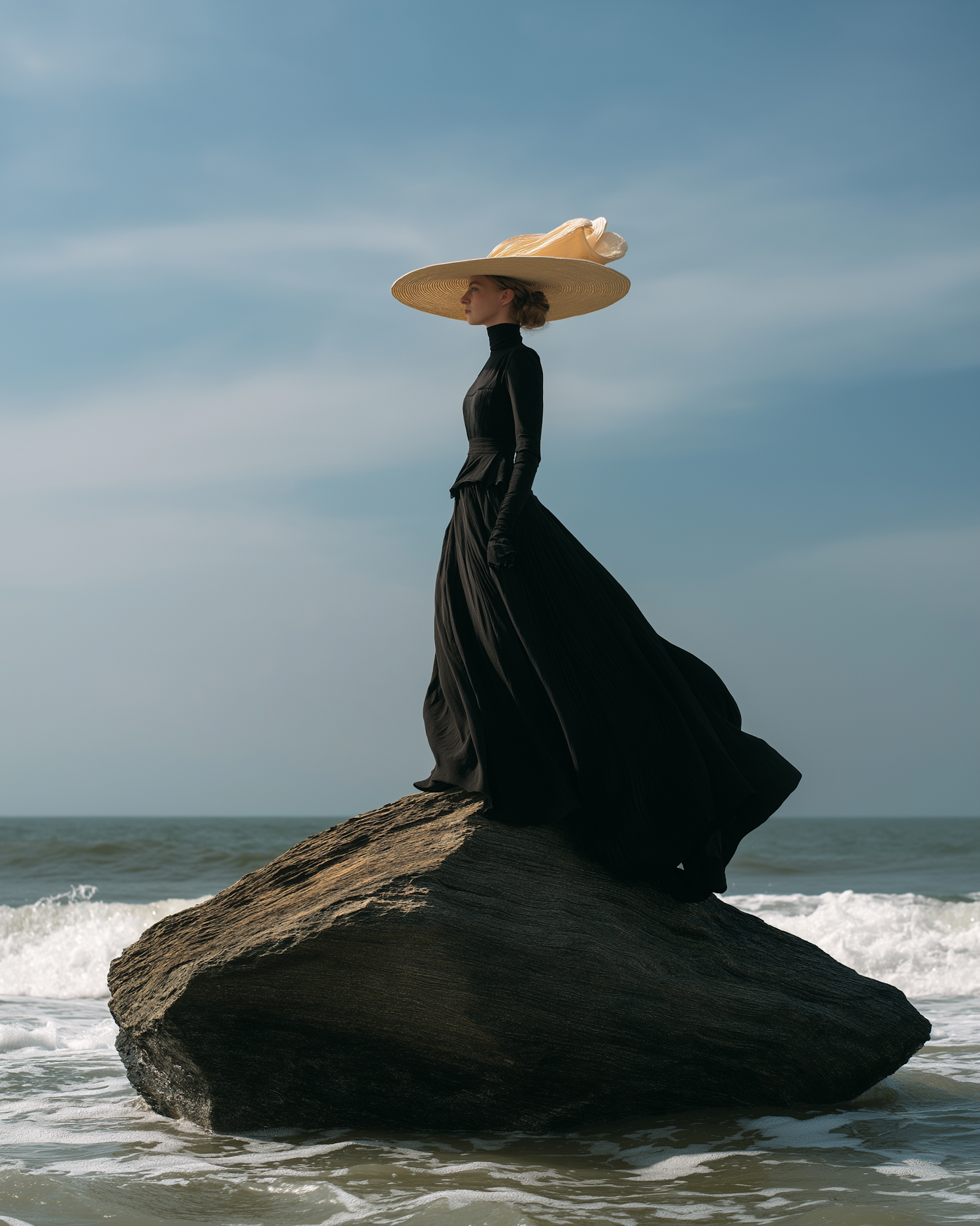 Elegant fashion meets nature—a figure stands on a rock by the sea wearing a dramatic black gown and a striking wide-brimmed straw hat.