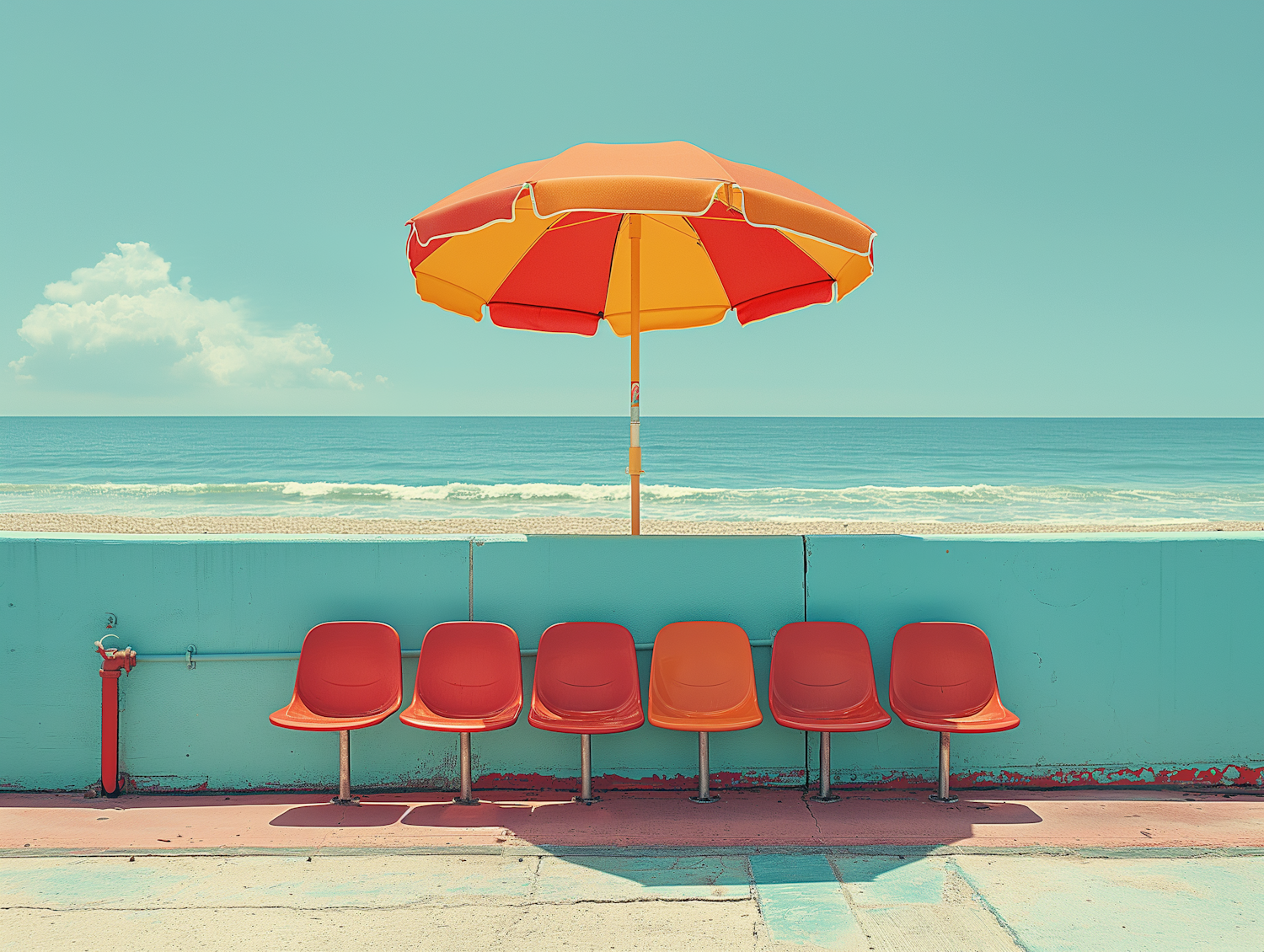 Retro beach scene with orange chairs, a colorful umbrella, and a serene ocean backdrop. Vibrant colors and nostalgic vibes.