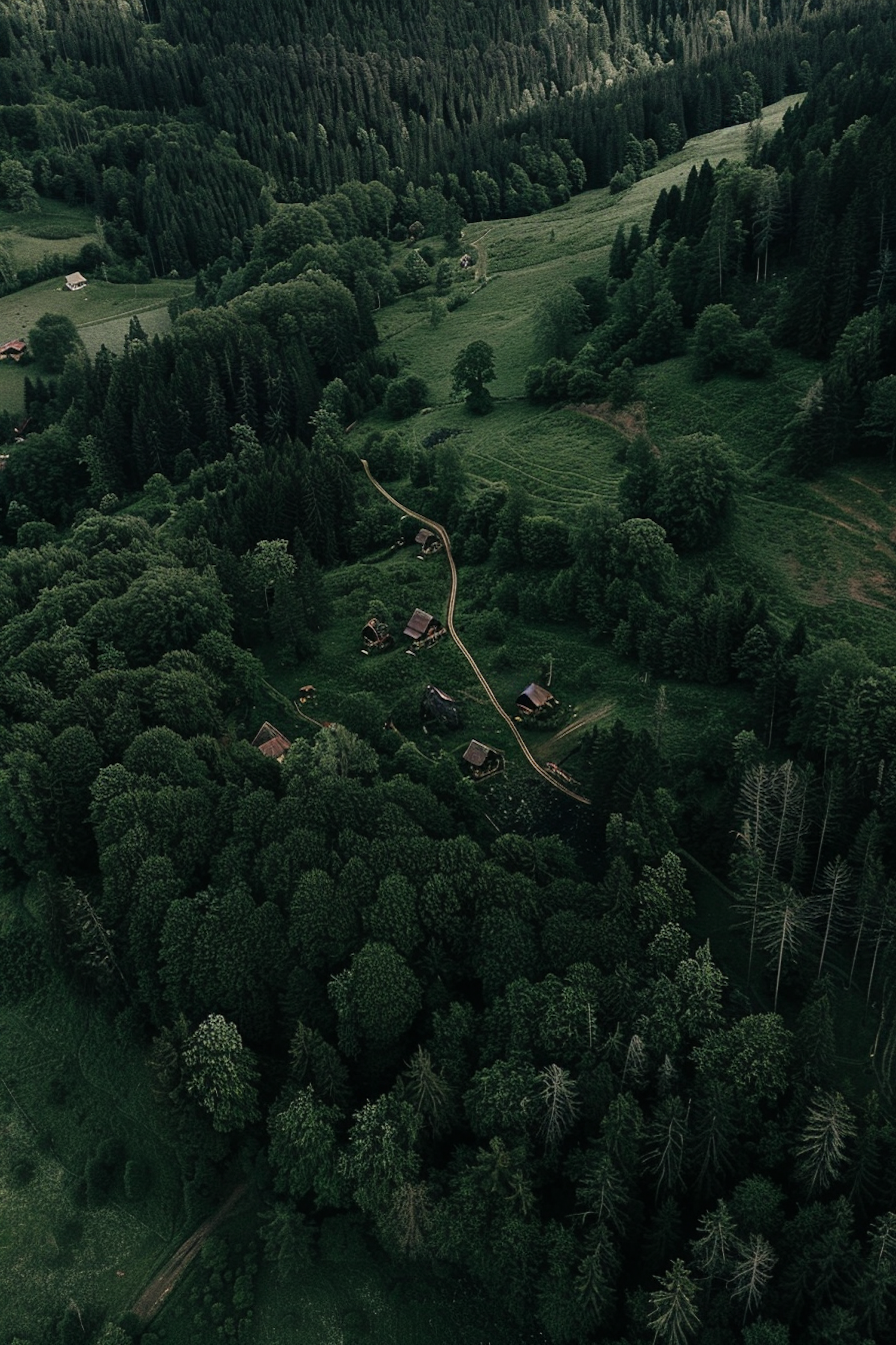 Aerial view of a lush forest with a winding path leading to rustic cabins, surrounded by dense greenery and serene nature.