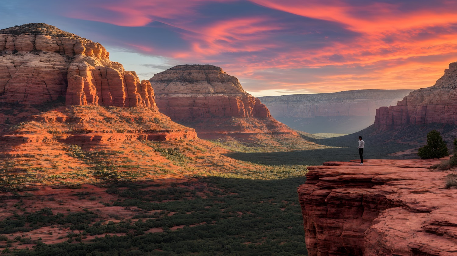 Stunning Sedona sunset with vibrant skies, red rock cliffs, and a lone figure on the edge, capturing the beauty of nature's grandeur.
