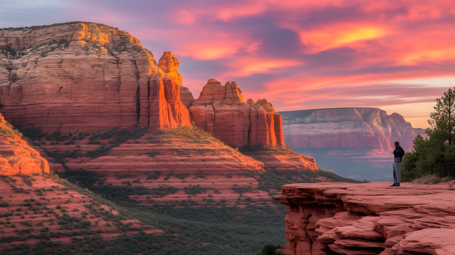 Stunning Sedona red rock formations at sunset with vibrant skies and a lone figure on a cliff, perfect for nature and travel inspiration.