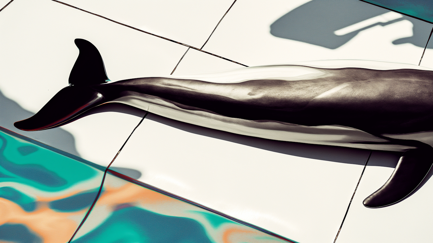 A dolphin rests on white tiles with vibrant turquoise and orange water reflections, creating a striking contrast and dynamic scene.