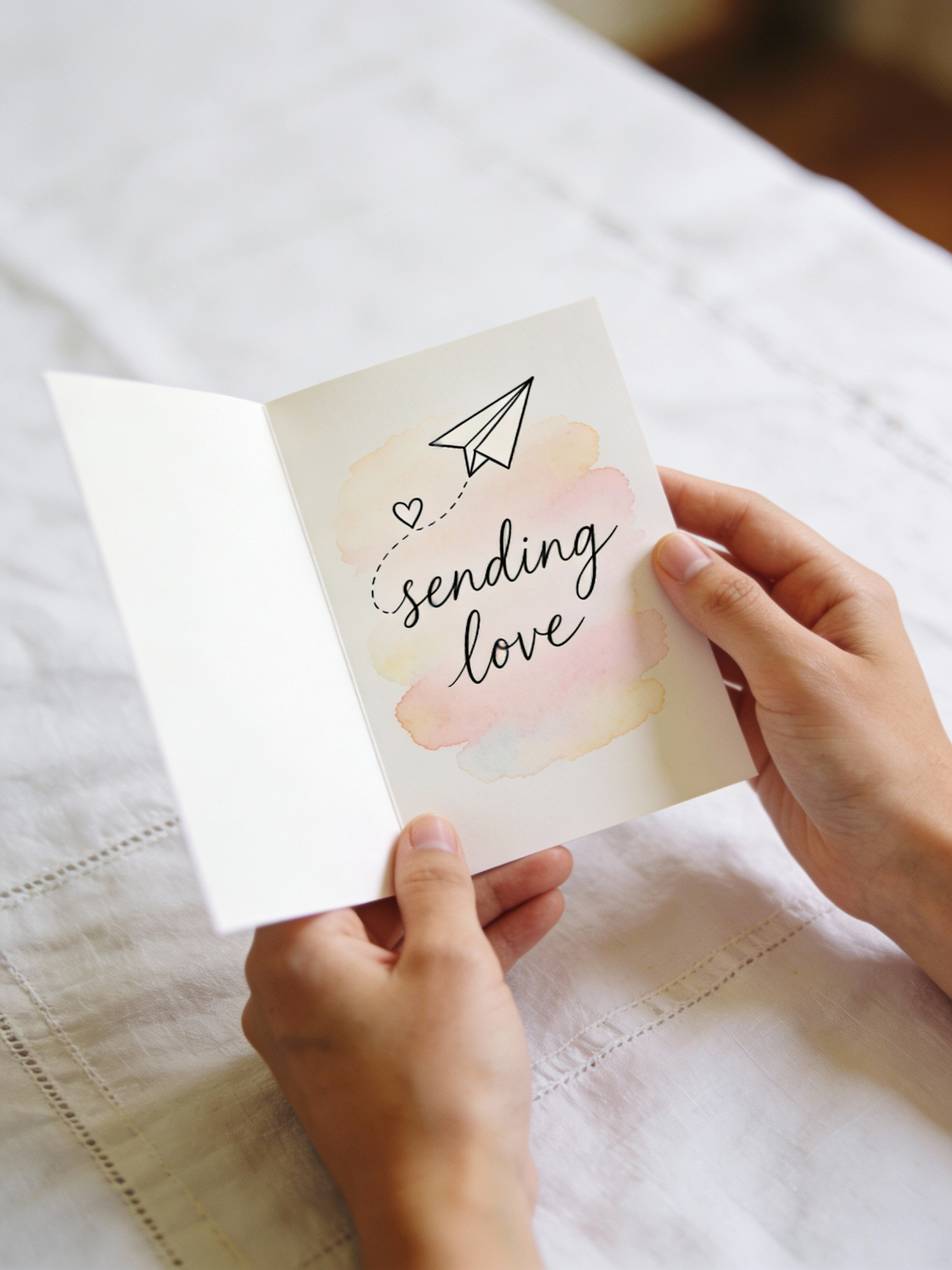 a hand-drawn card with the text "sending love" and a simple line art illustration of a paper airplane with a heart, pastel watercolor wash, holding the card in one's hands, white linen tablecloth background, slightly open, soft daylight, realistic photo, no extra text, no logos, no watermark