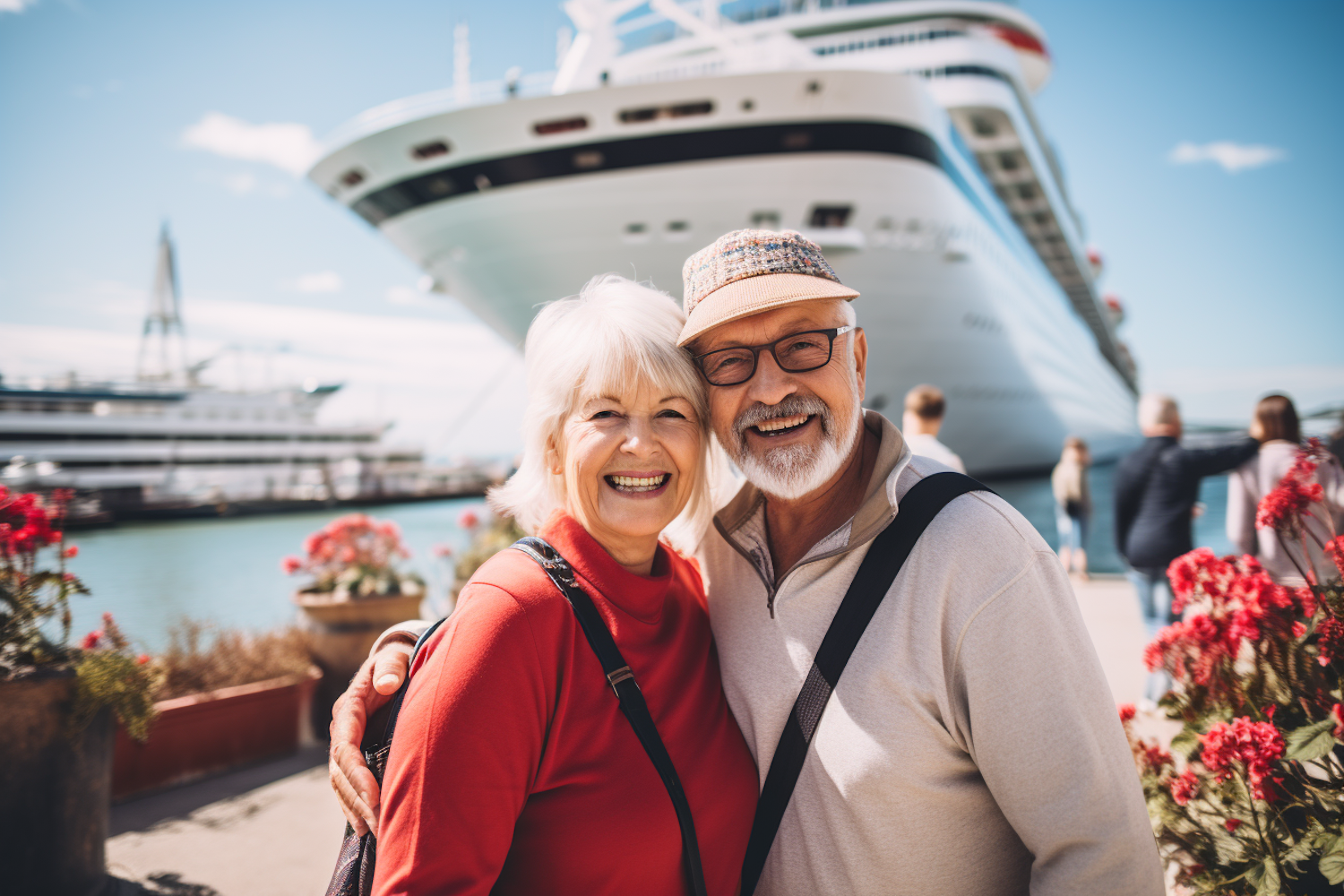 Elderly couple smiling in front of a cruise ship, enjoying a sunny day at the dock with vibrant red flowers around.