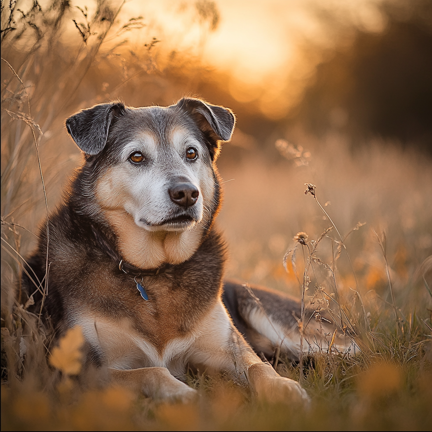 A senior dog with gray-brown fur rests in golden grass at sunset, exuding calmness and wisdom in warm, tranquil light.