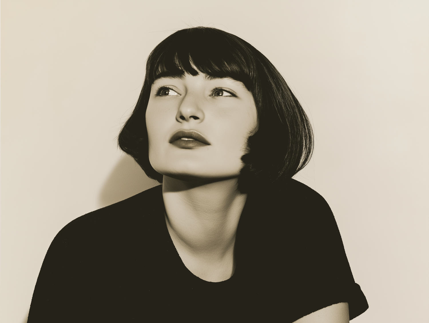 Sepia-toned portrait of a woman with a sleek bob haircut, gazing upward with a contemplative expression against a plain background.