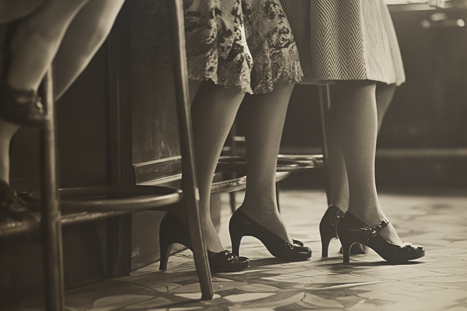 Vintage black and white photo of women in high heels at a bar, showcasing retro fashion with patterned skirts and elegant shoes.