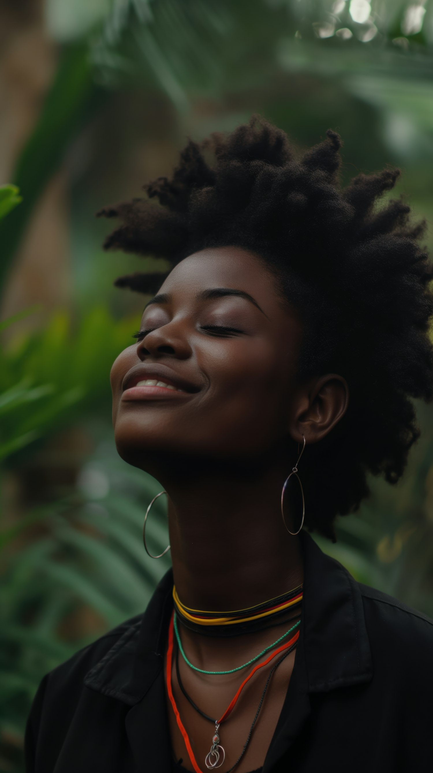 A serene portrait of a young Black woman with natural afro hair, colorful necklaces, and a peaceful smile, set against lush greenery.