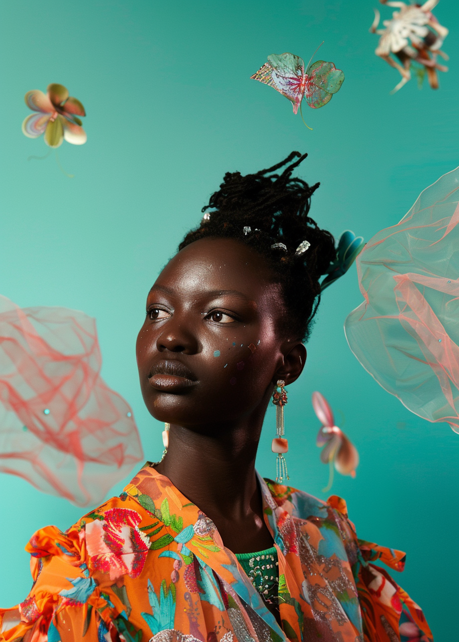 Portrait of a woman in vibrant floral attire, adorned with beads and confetti, set against a teal background with butterflies.
