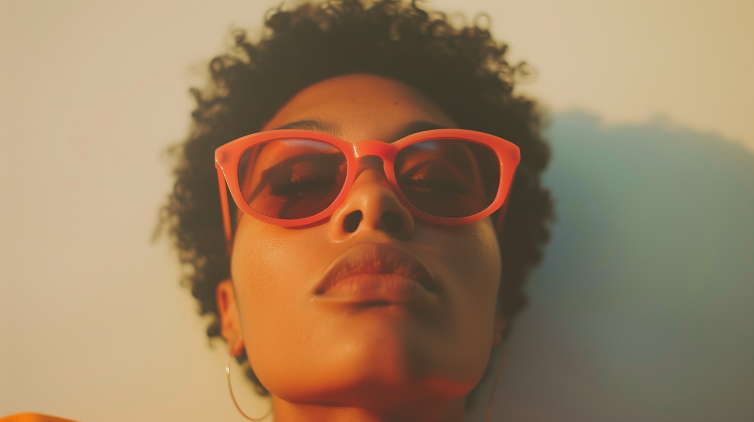 Close-up of a woman with orange sunglasses, curly hair, and hoop earrings, basking in warm light. Relaxed and stylish vibe.