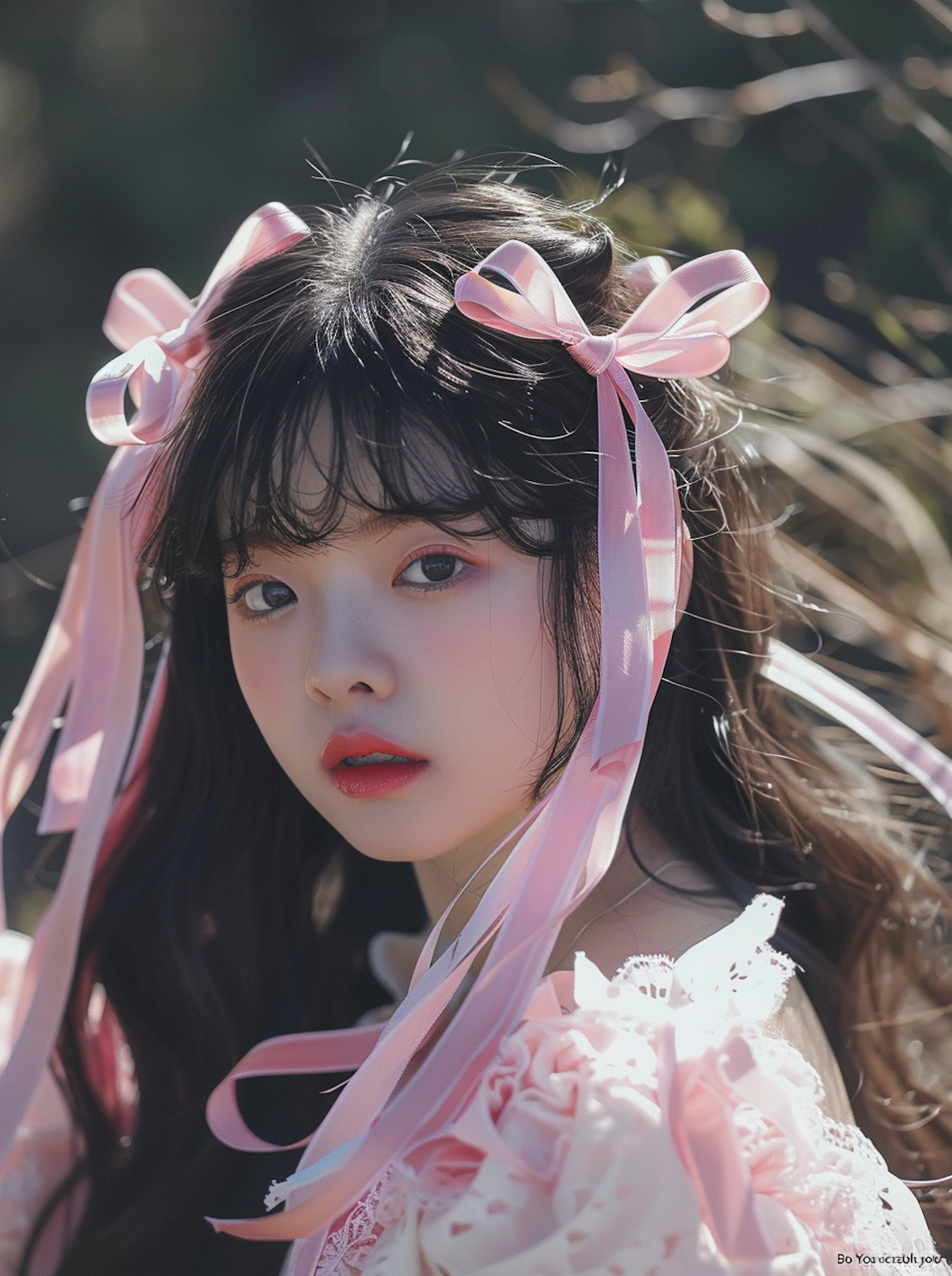 Asian woman with pink ribbons in her hair, wearing a pink lace dress. Soft focus background with greenery. Elegant and serene expression.