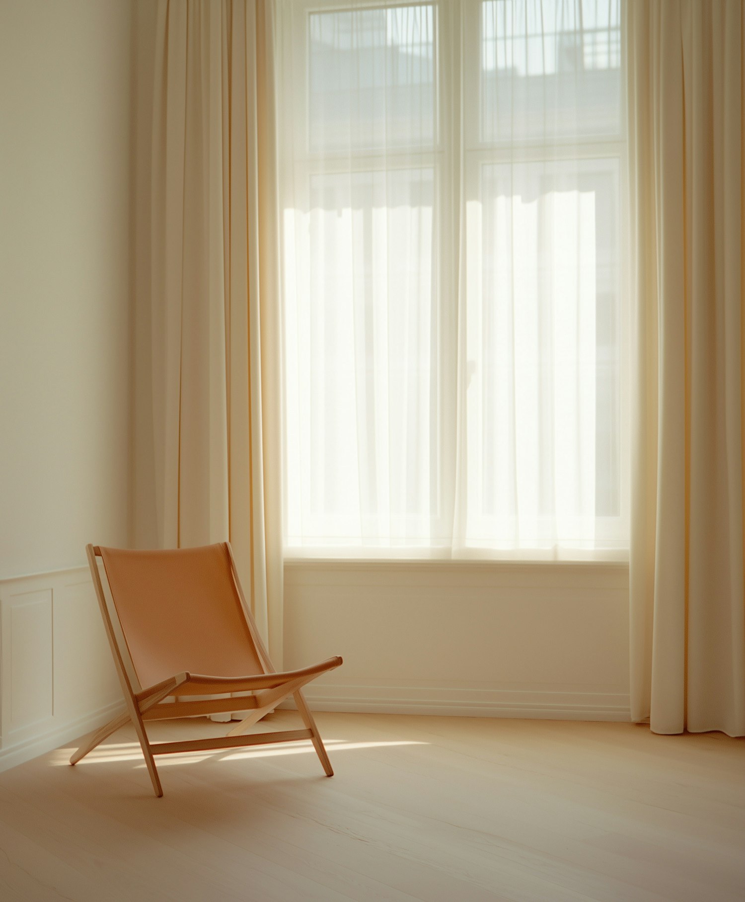 Minimalist room with a tan leather chair, sheer curtains, and soft natural light creating a serene atmosphere.