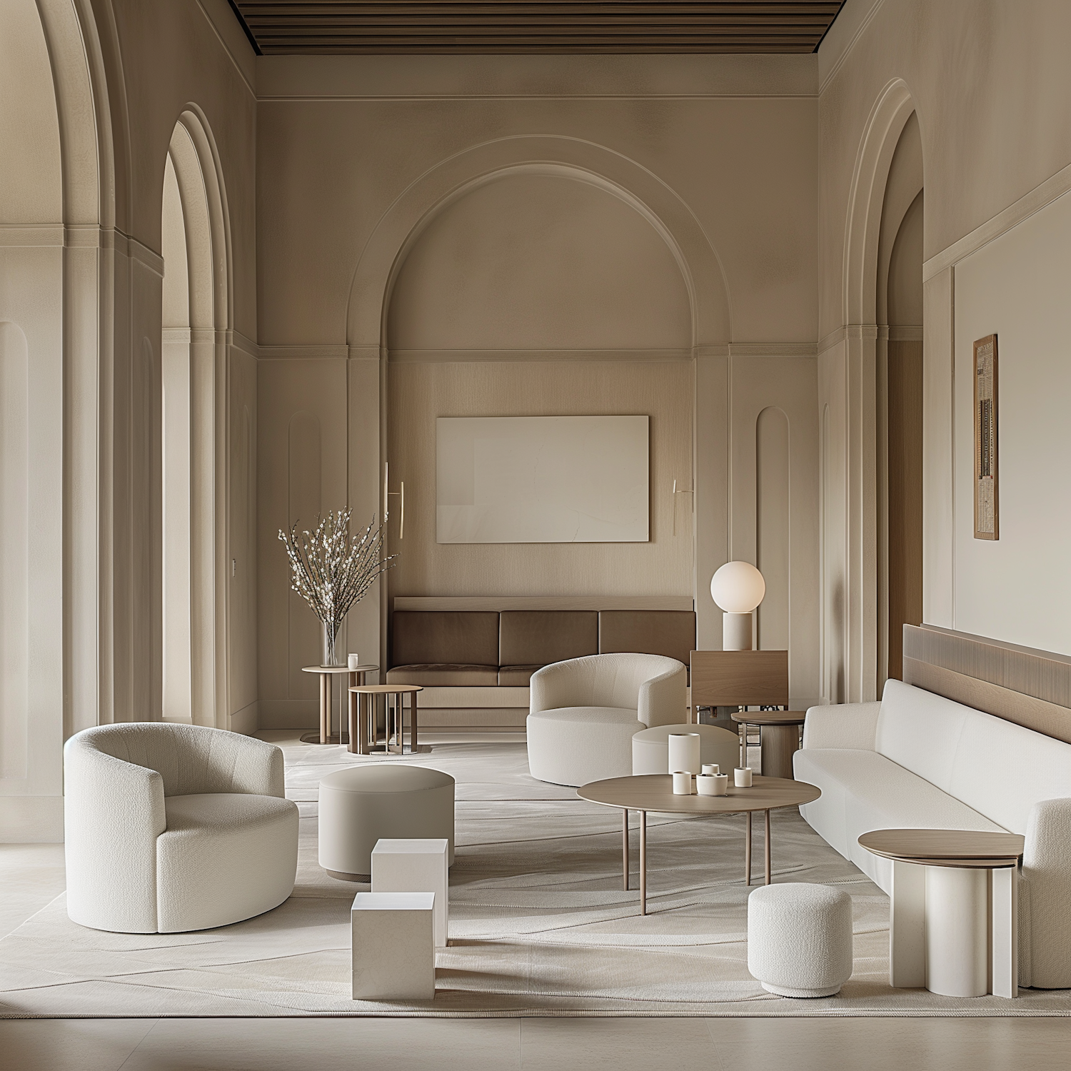 Elegant minimalist living room with arched ceilings, neutral tones, modern furniture, and natural light creating a serene atmosphere.