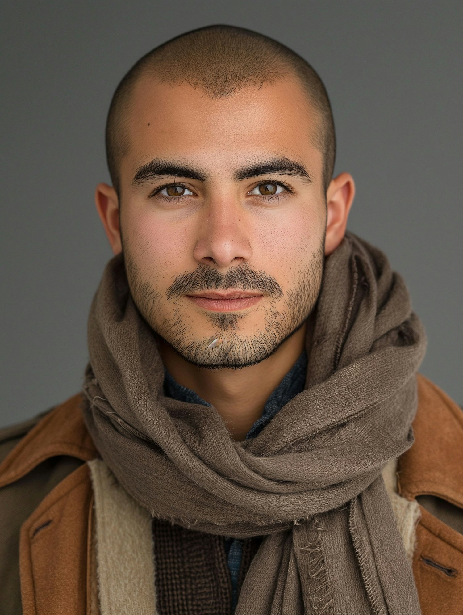 Young man with shaved head, brown scarf, and coat, gazing confidently at the camera against a gray background.