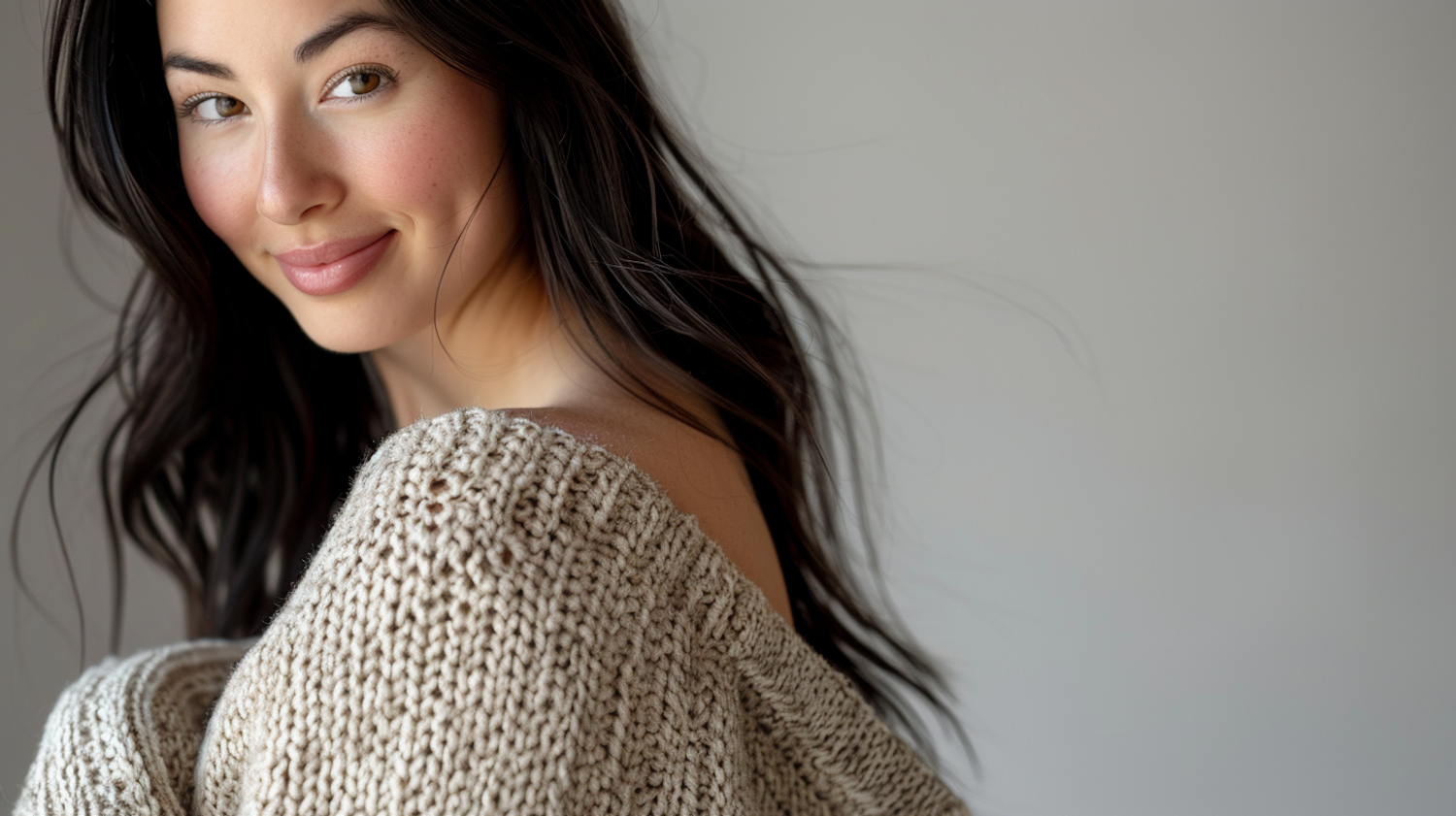 Young woman with dark hair in a beige knitted sweater, smiling softly against a gray background.