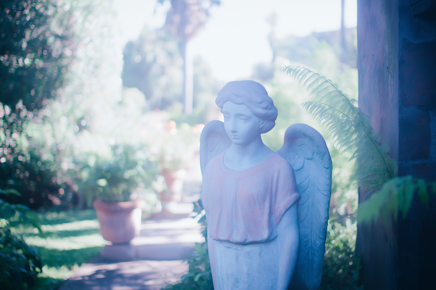 Serene garden scene with a soft-hued angel graveyard statue surrounded by lush greenery under natural light.