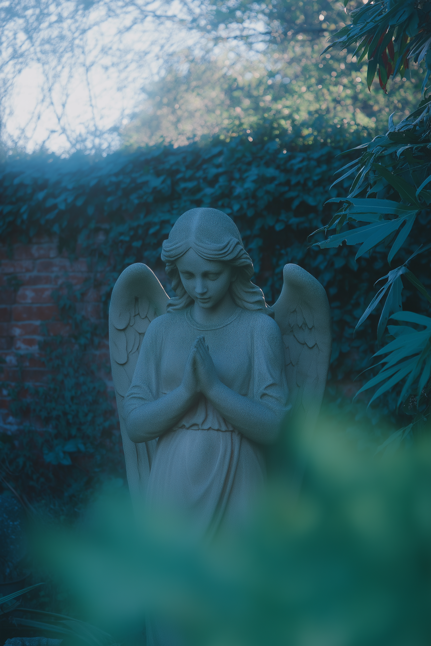 A serene stone angel graveyard statue in prayer, set against a lush garden backdrop of greenery and a brick wall overgrown with ivy.