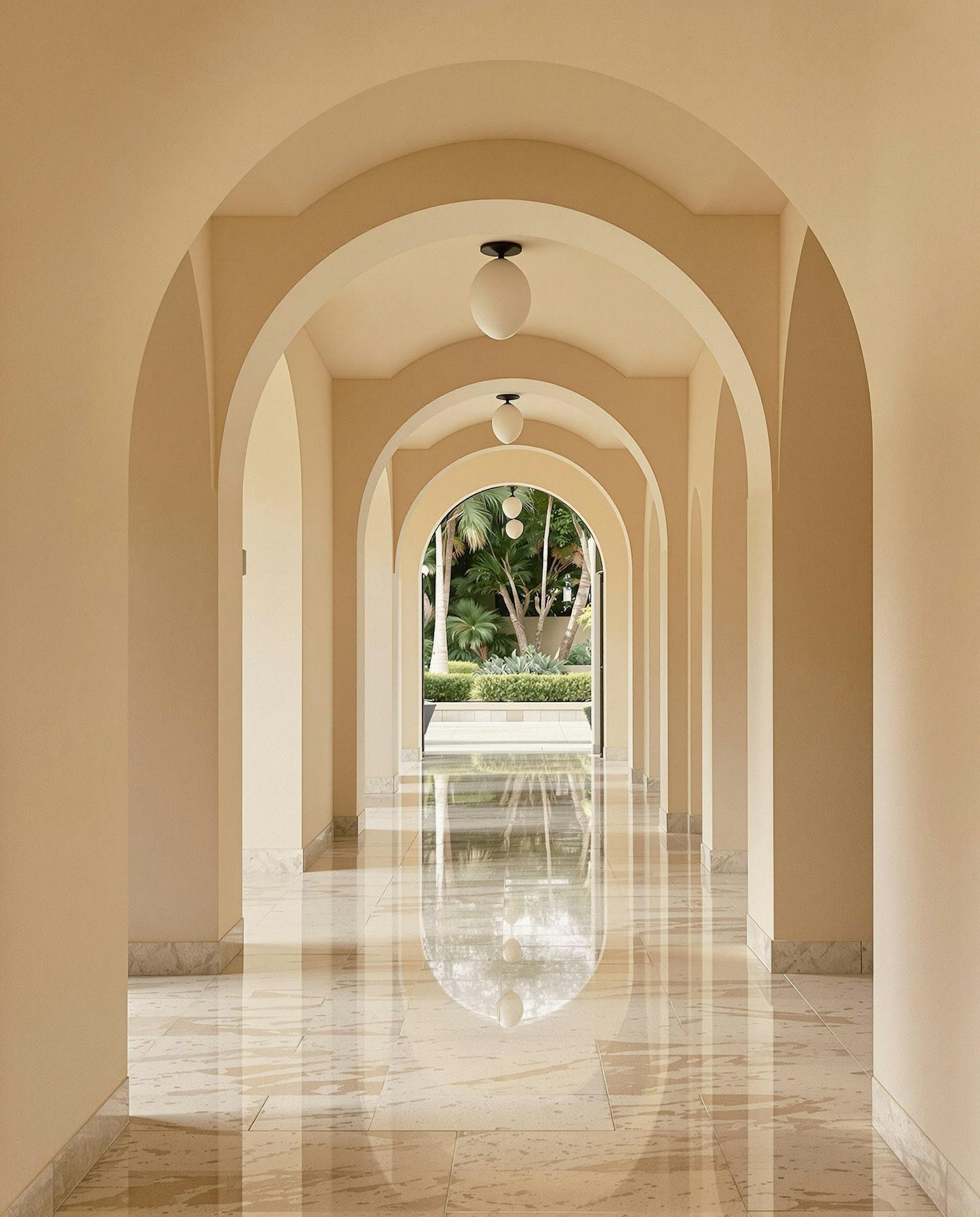 Elegant arched hallway with polished marble floors, warm lighting, and lush greenery visible at the end. A serene architectural design.