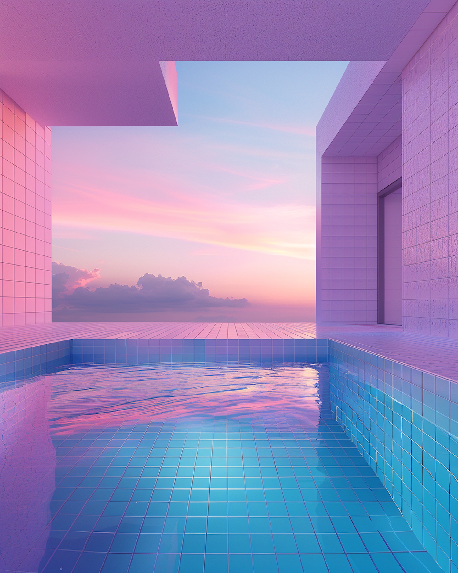 Modern pool with pastel sunset reflections, surrounded by sleek white tiles. A serene blend of architecture and nature.