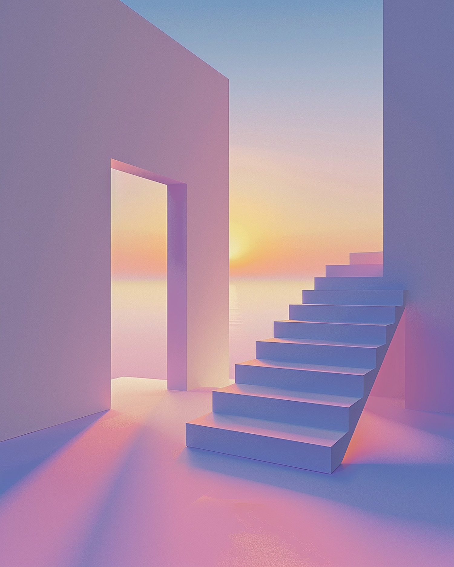 Surreal minimalist scene with pastel stairs and a gradient sky, evoking tranquility and dreamlike possibilities.