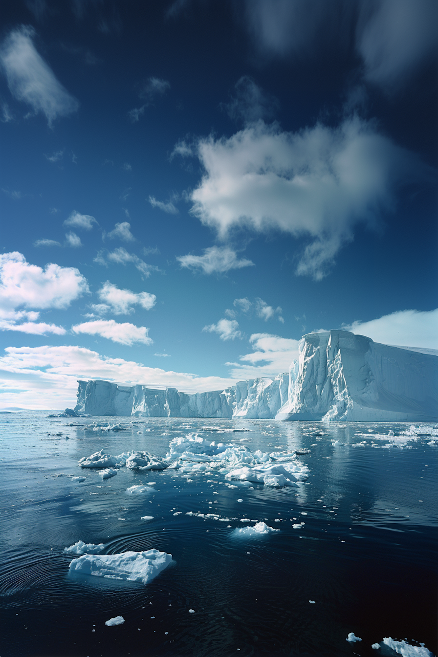 Majestic icebergs under a deep blue sky with scattered clouds, reflecting in calm waters. A serene and pristine polar landscape.