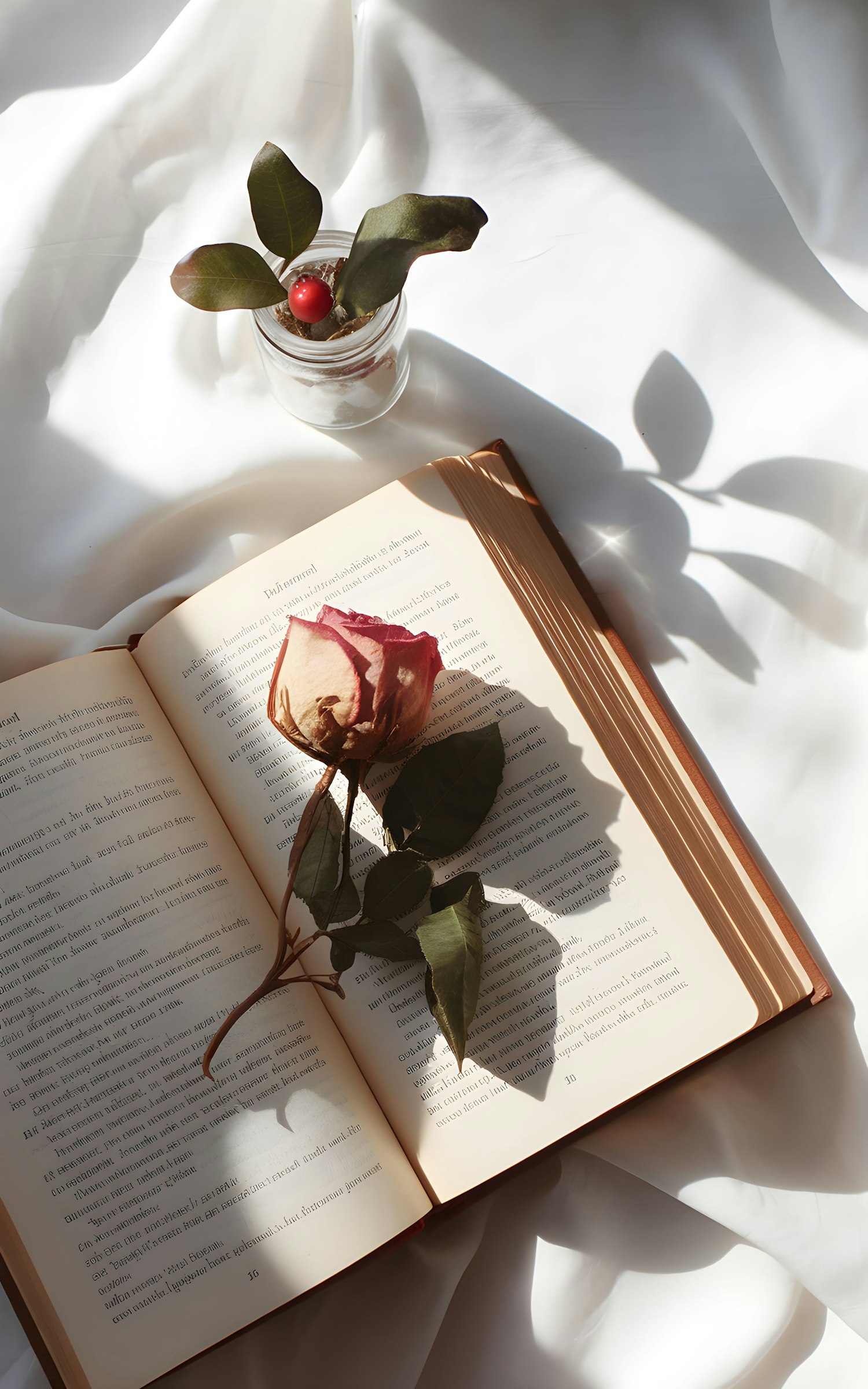 A dried rose on an open book with Thai script, next to a jar with leaves and a red berry, bathed in soft sunlight.