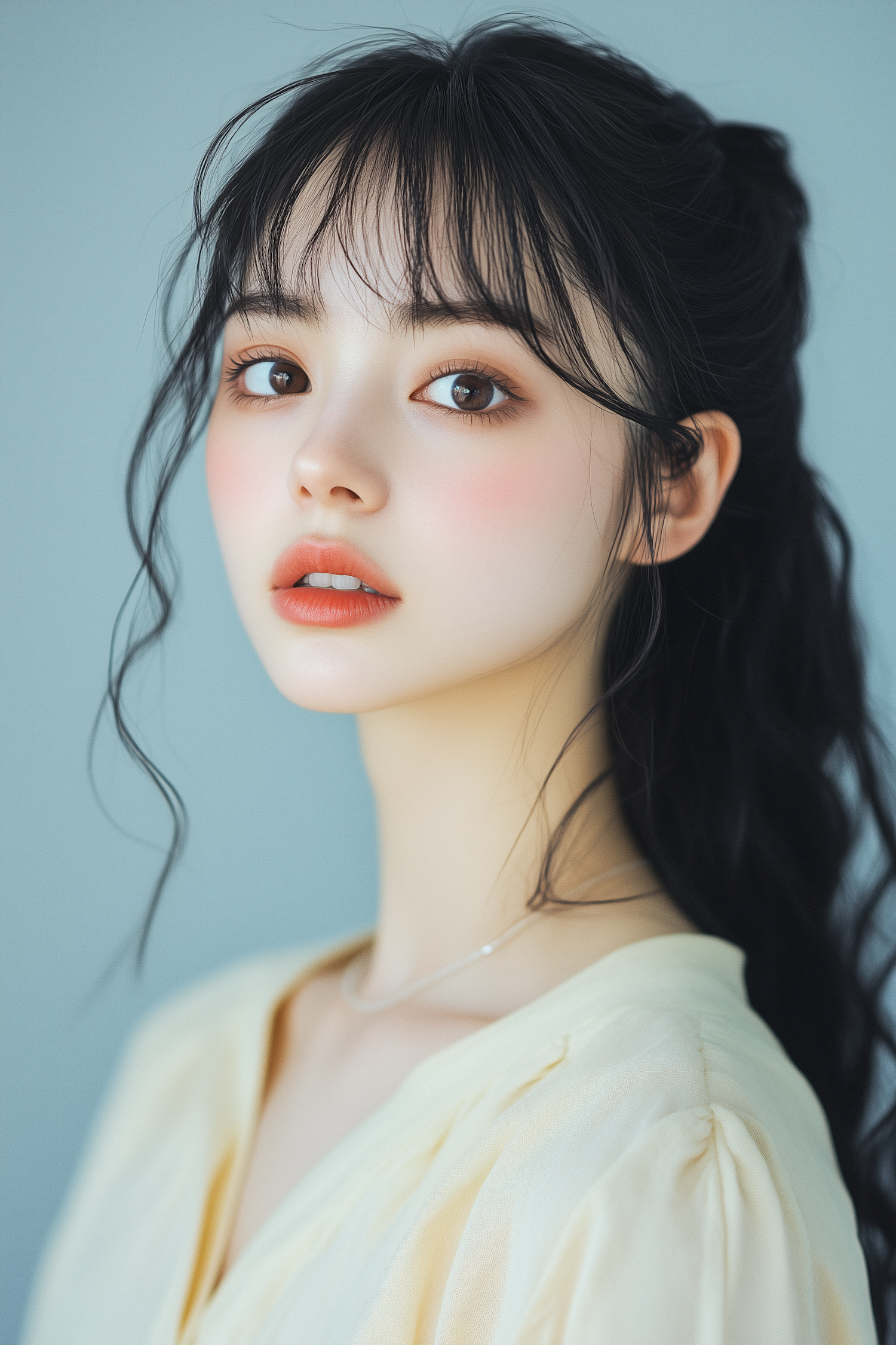 A serene portrait of a young woman with wavy dark hair, coral lips, and a pale yellow blouse against a muted blue background.