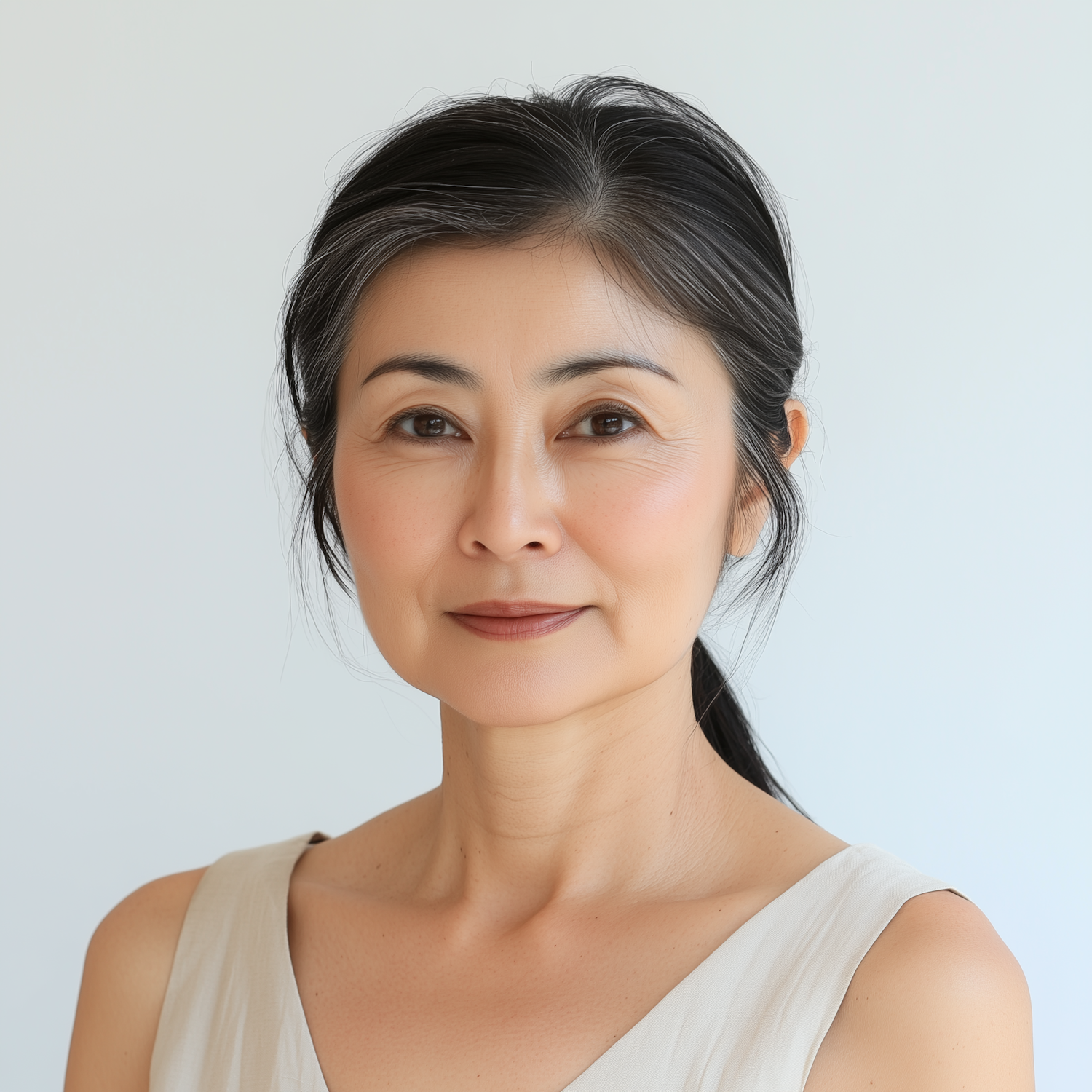 Portrait of a middle-aged Asian woman with gray-streaked hair, soft brown eyes, and a calm expression, wearing a beige sleeveless top.