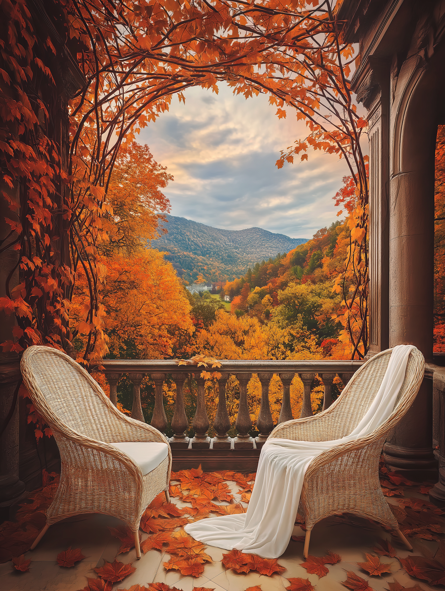 Serene autumn balcony with wicker chairs, vibrant foliage, and a stunning view of rolling hills under a soft, cloudy sky.