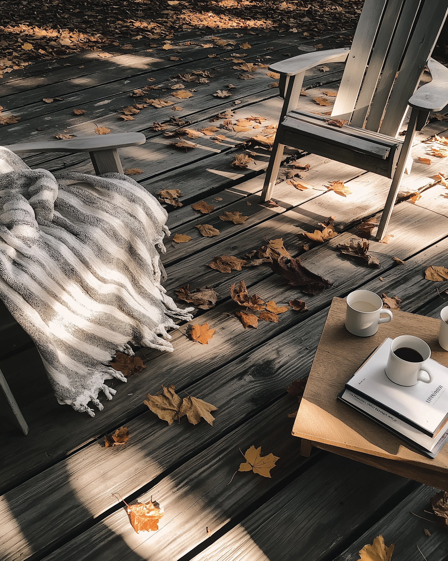 Cozy autumn deck scene with wooden chairs, a striped blanket, and mugs of coffee on a table, surrounded by fallen leaves.