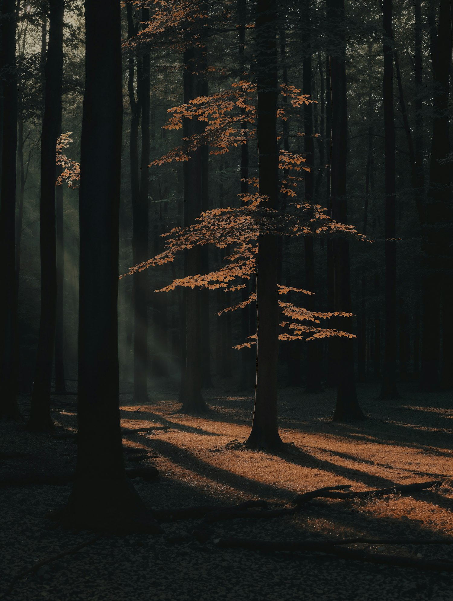Sunlit forest with autumn leaves and dramatic shadows, creating a tranquil and mystical atmosphere.