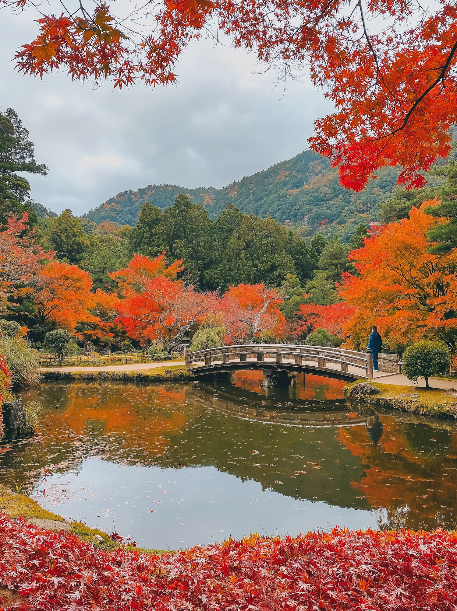 Serene garden with vibrant autumn foliage, a wooden bridge over a pond, and a person enjoying the scenic view.