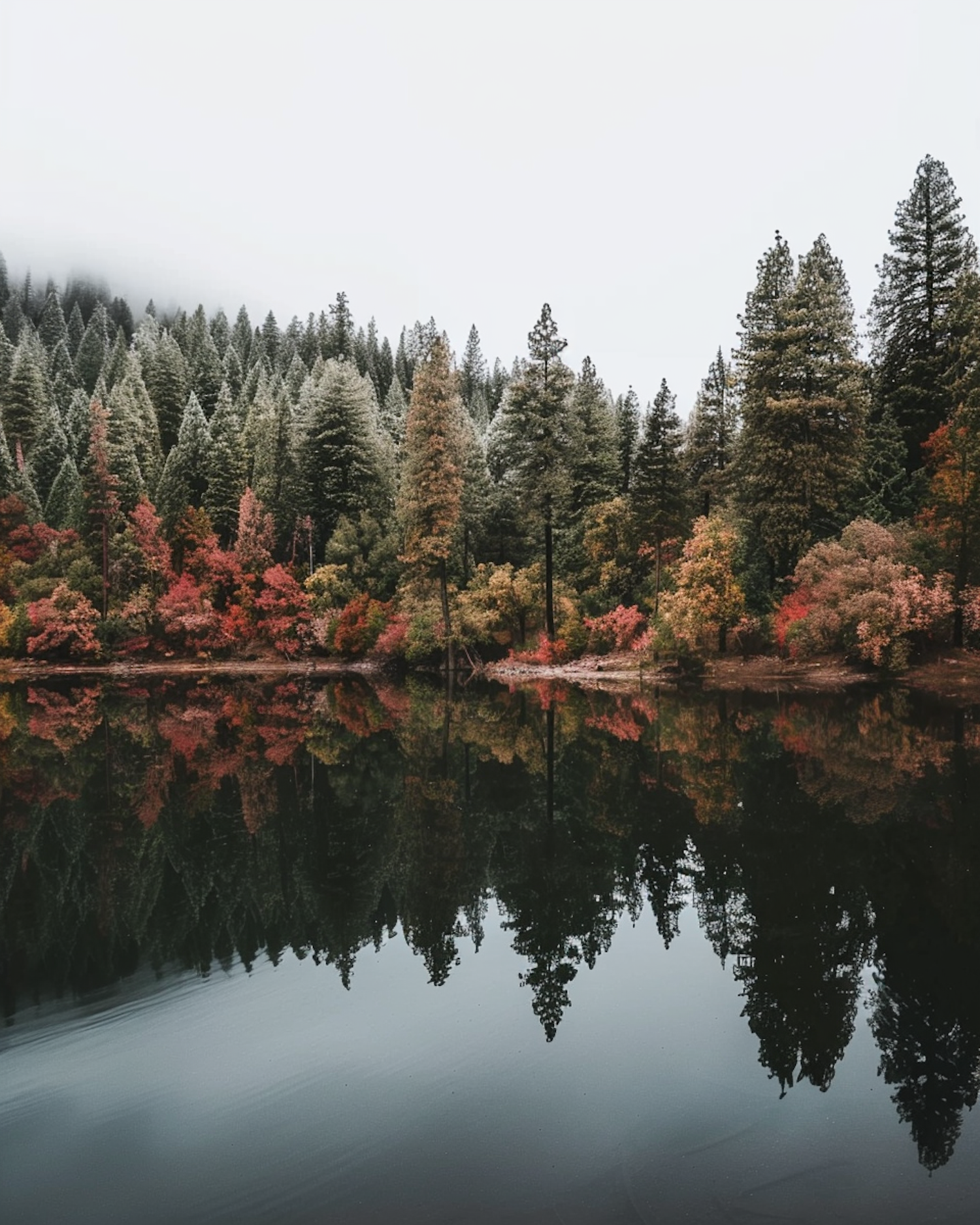 Tranquil forest with autumn colors reflected in a calm lake, under an overcast sky, creating a serene and symmetrical scene.