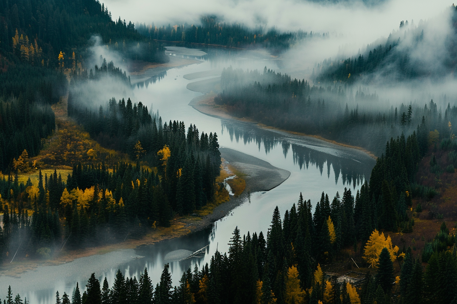 Misty river winding through a dense forest with autumn colors and reflections, creating a serene and mystical landscape.