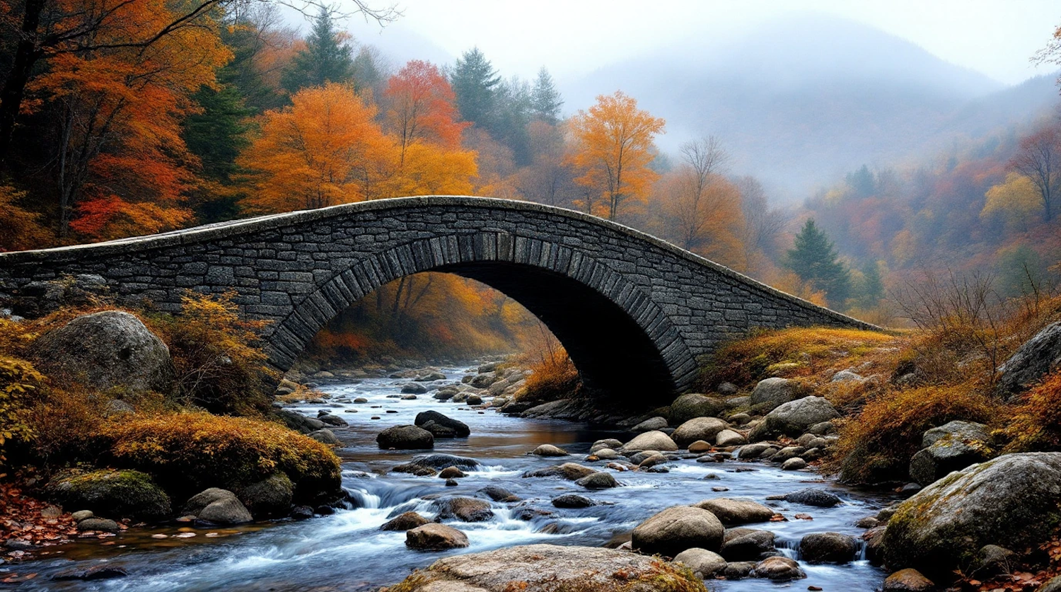 Stone bridge over a stream in a vibrant autumn landscape with colorful trees and misty hills.