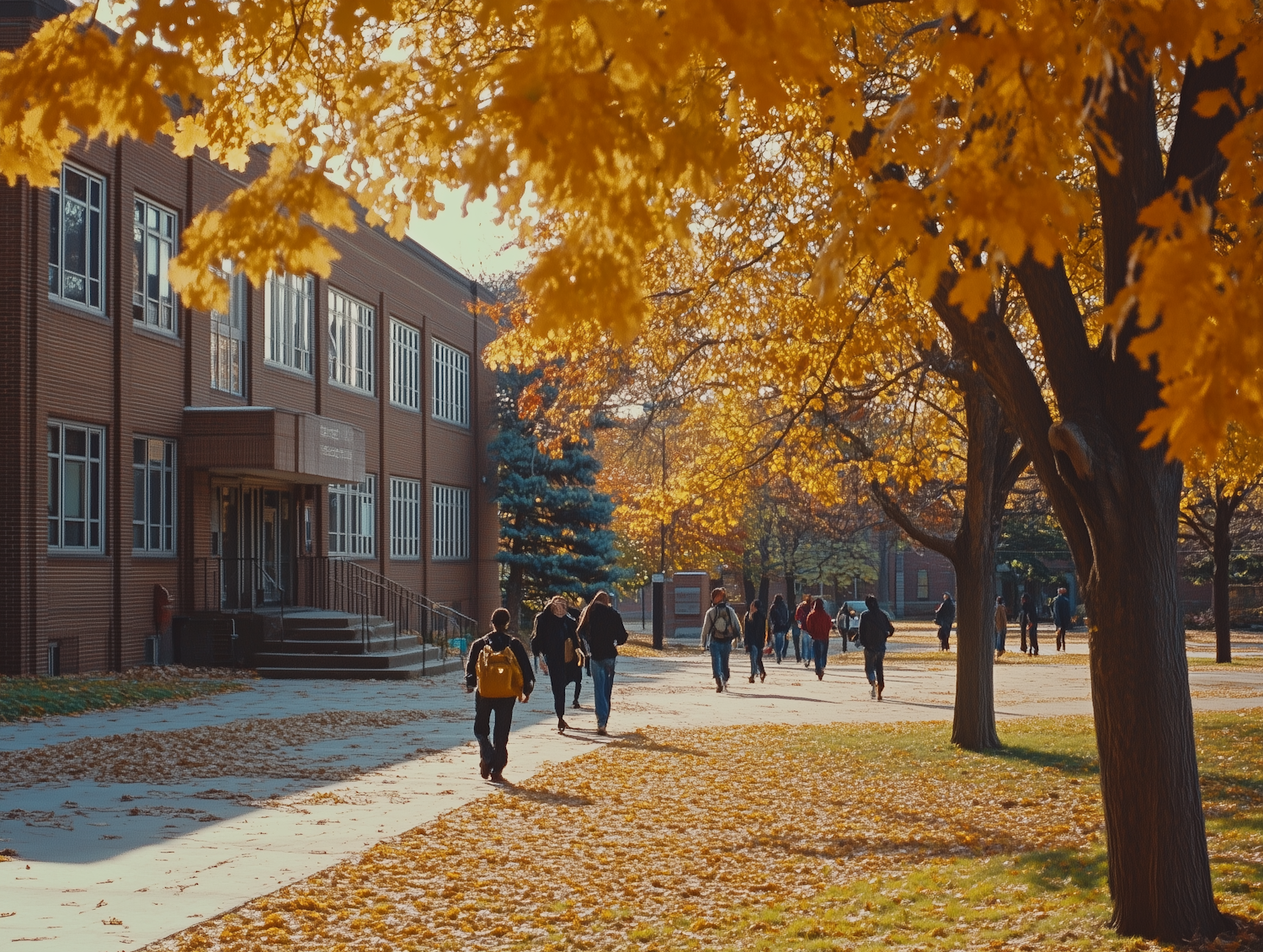 Autumn scene on a university campus with people walking under vibrant yellow trees and a brick building in the background.