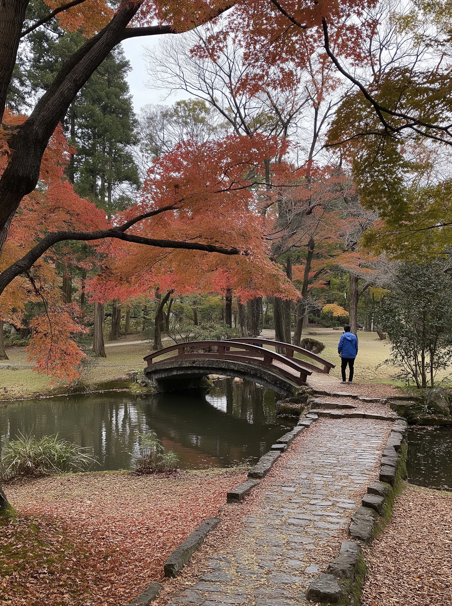 Tranquil garden scene with a wooden bridge, vibrant autumn leaves, and a person in a blue jacket. Perfect for nature lovers.