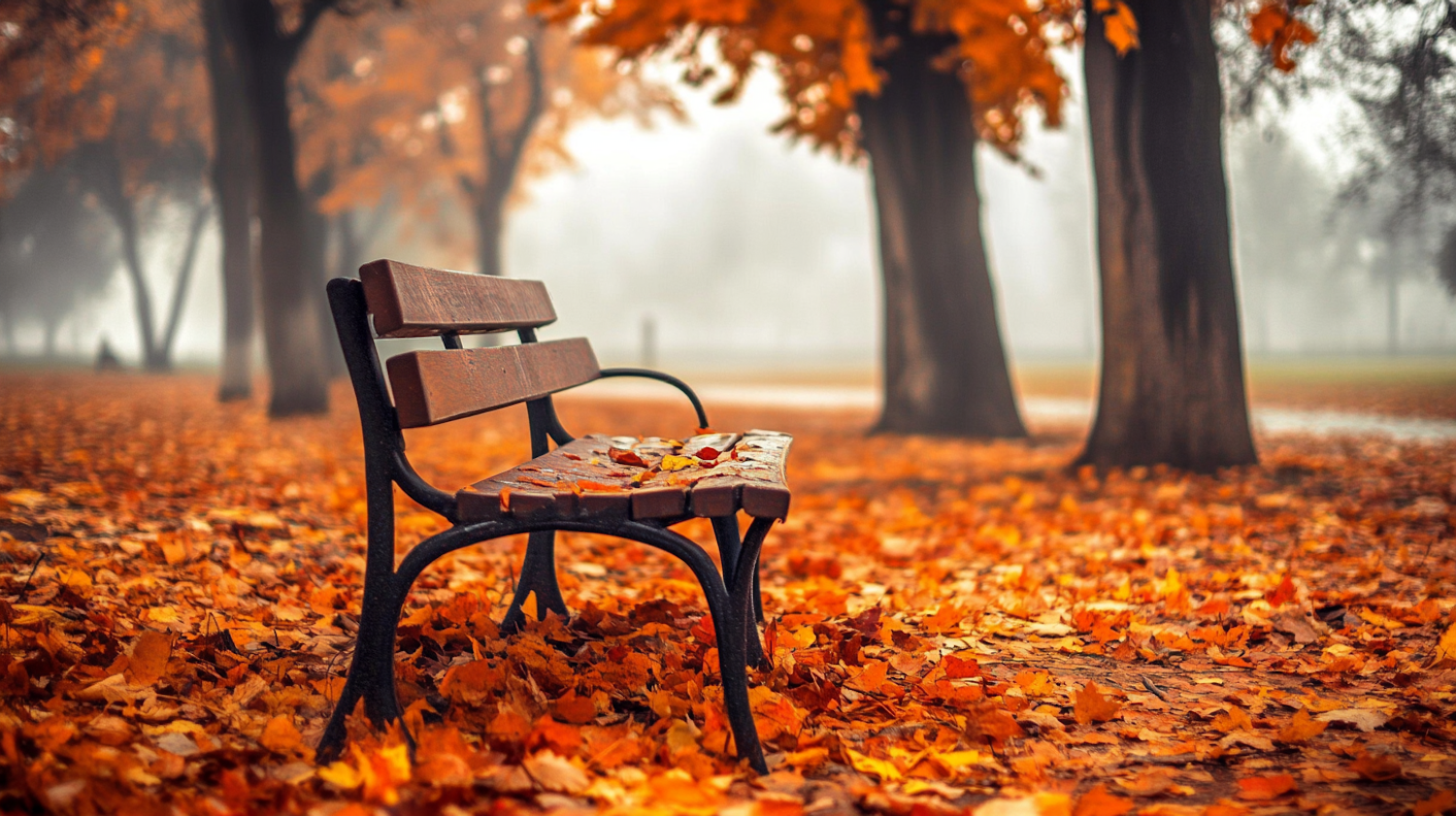 Serene autumn park scene with a wooden bench surrounded by vibrant orange leaves and misty trees.