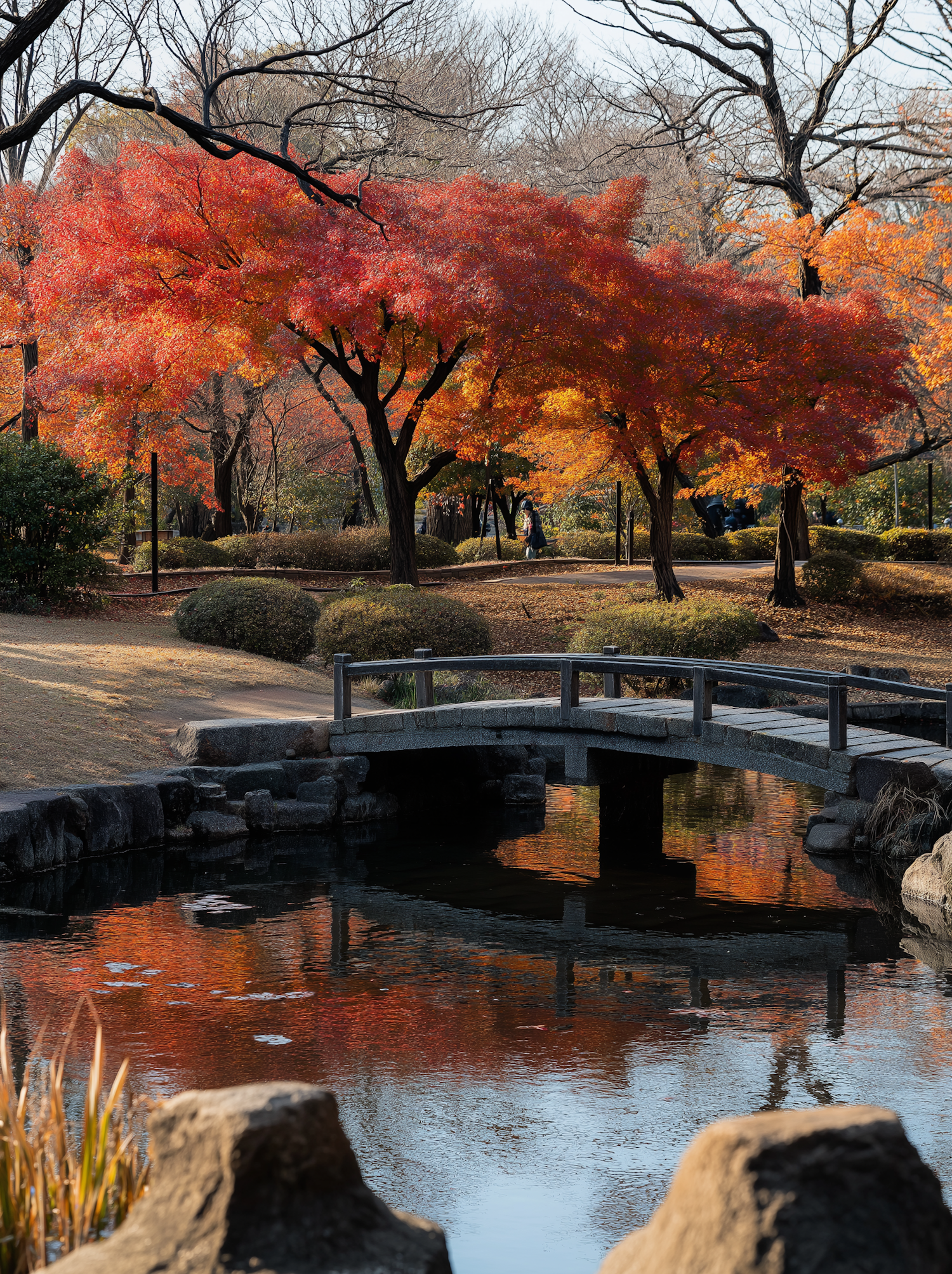 Serene park scene with a stone bridge over a pond, vibrant autumn trees, and a peaceful atmosphere.
