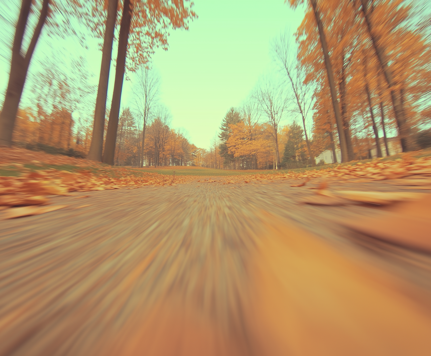 Dynamic low-angle view of an autumn path with fallen leaves and bare trees, creating a sense of motion and seasonal beauty.