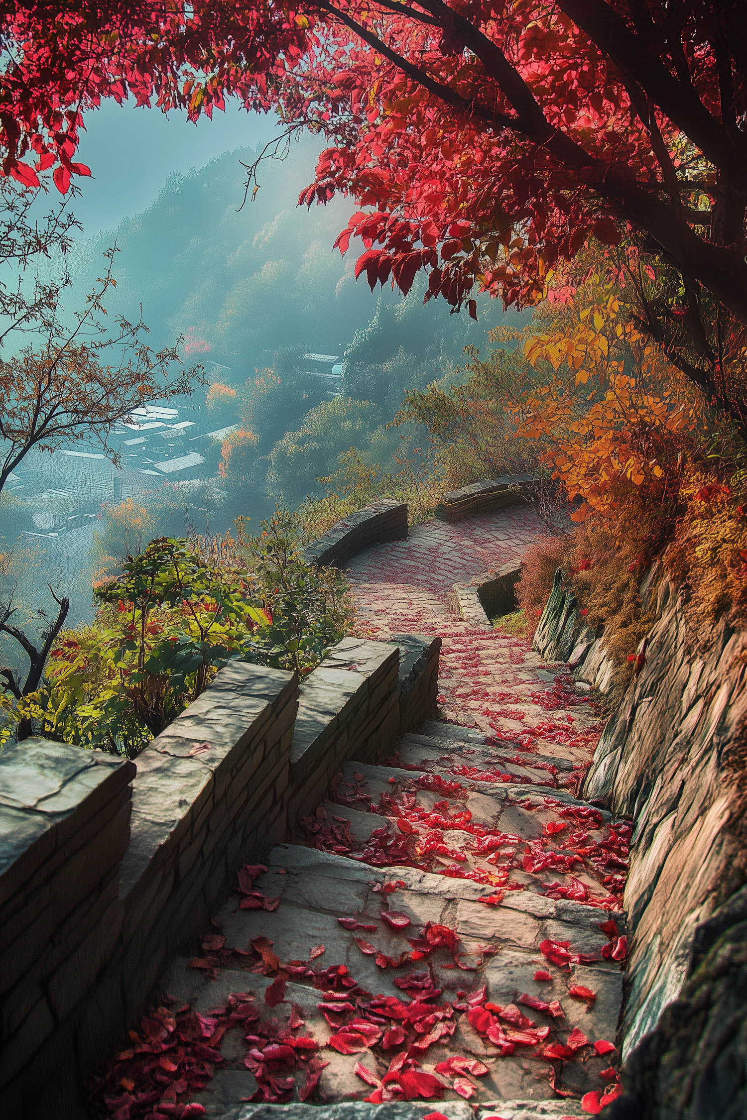 A picturesque stone path covered in autumn leaves, surrounded by vibrant red foliage and a misty hillside view.