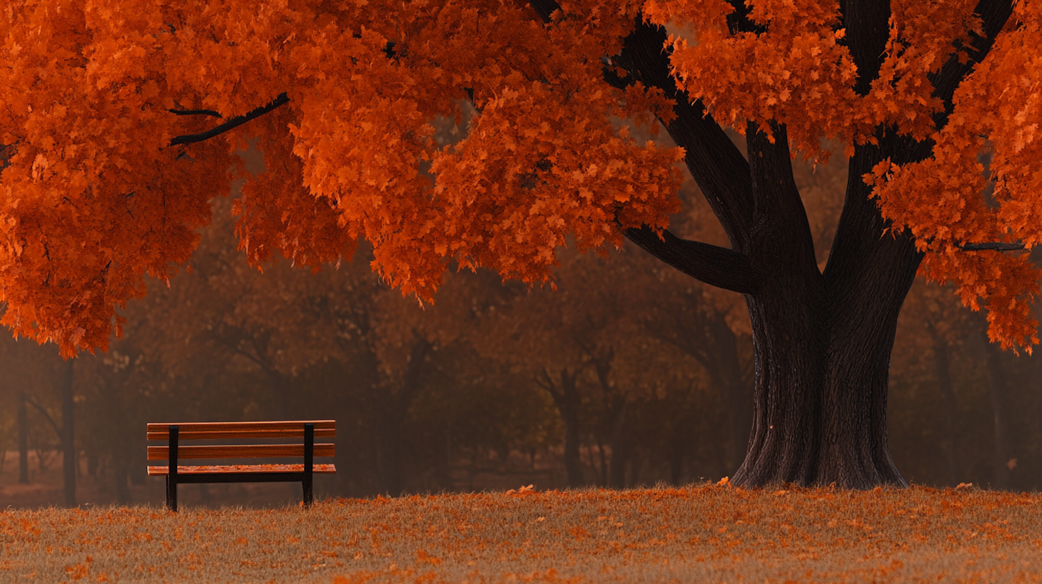 Serene autumn scene with a vibrant orange tree and a wooden bench, set against a backdrop of softly blurred trees.
