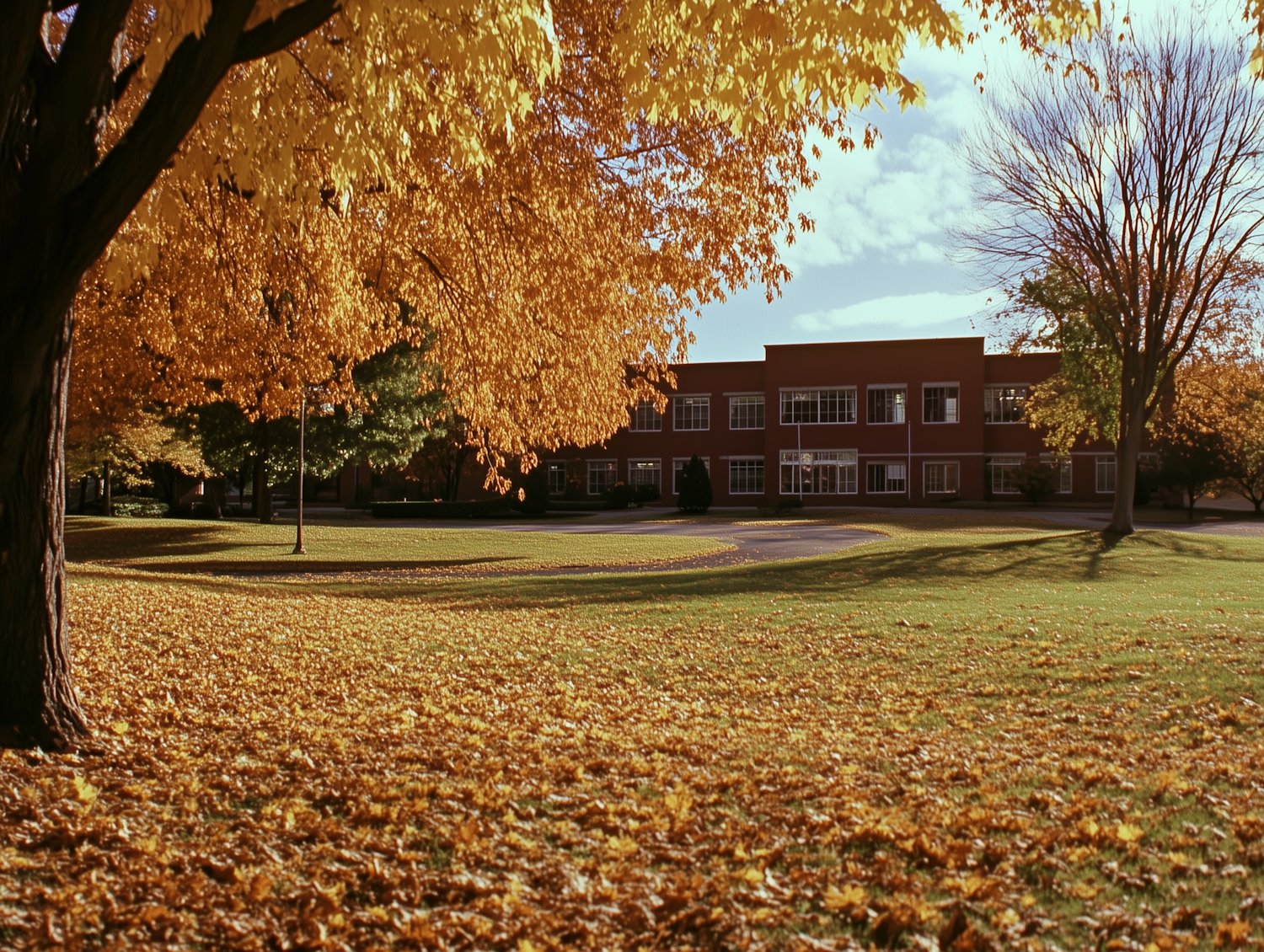 Autumn scene with golden leaves, a red-brick building, and a clear blue sky. Sunlight filters through, creating a warm, serene atmosphere.