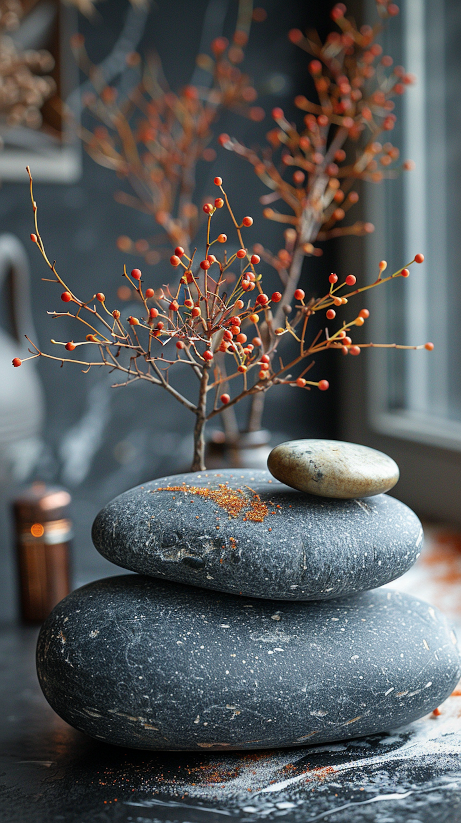 Zen-inspired stone and berry arrangement with smooth gray stones and vibrant red berries, creating a tranquil and harmonious scene.