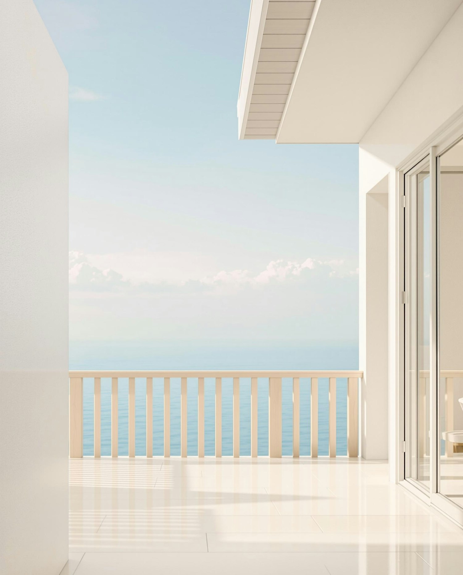 Minimalist balcony with ocean view, featuring wooden railings, glossy tiles, and a modern glass door under a clear blue sky.
