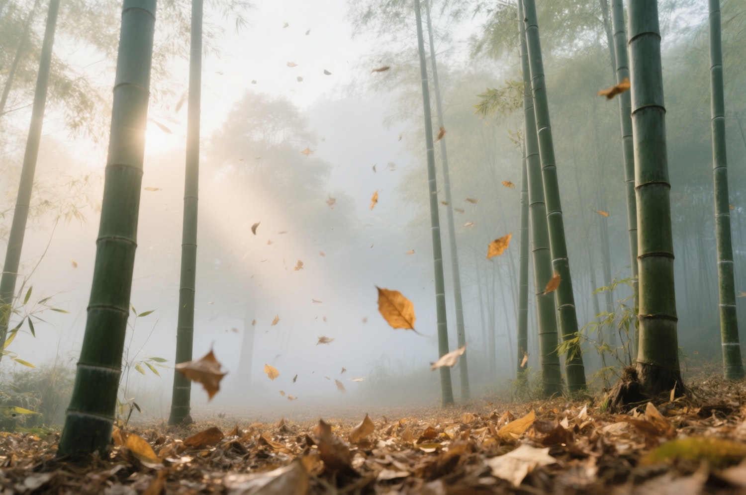 A foggy bamboo forest at dawn, shafts of light cutting through mist, fallen leaves swirling in the breeze, Wuxia-inspired.